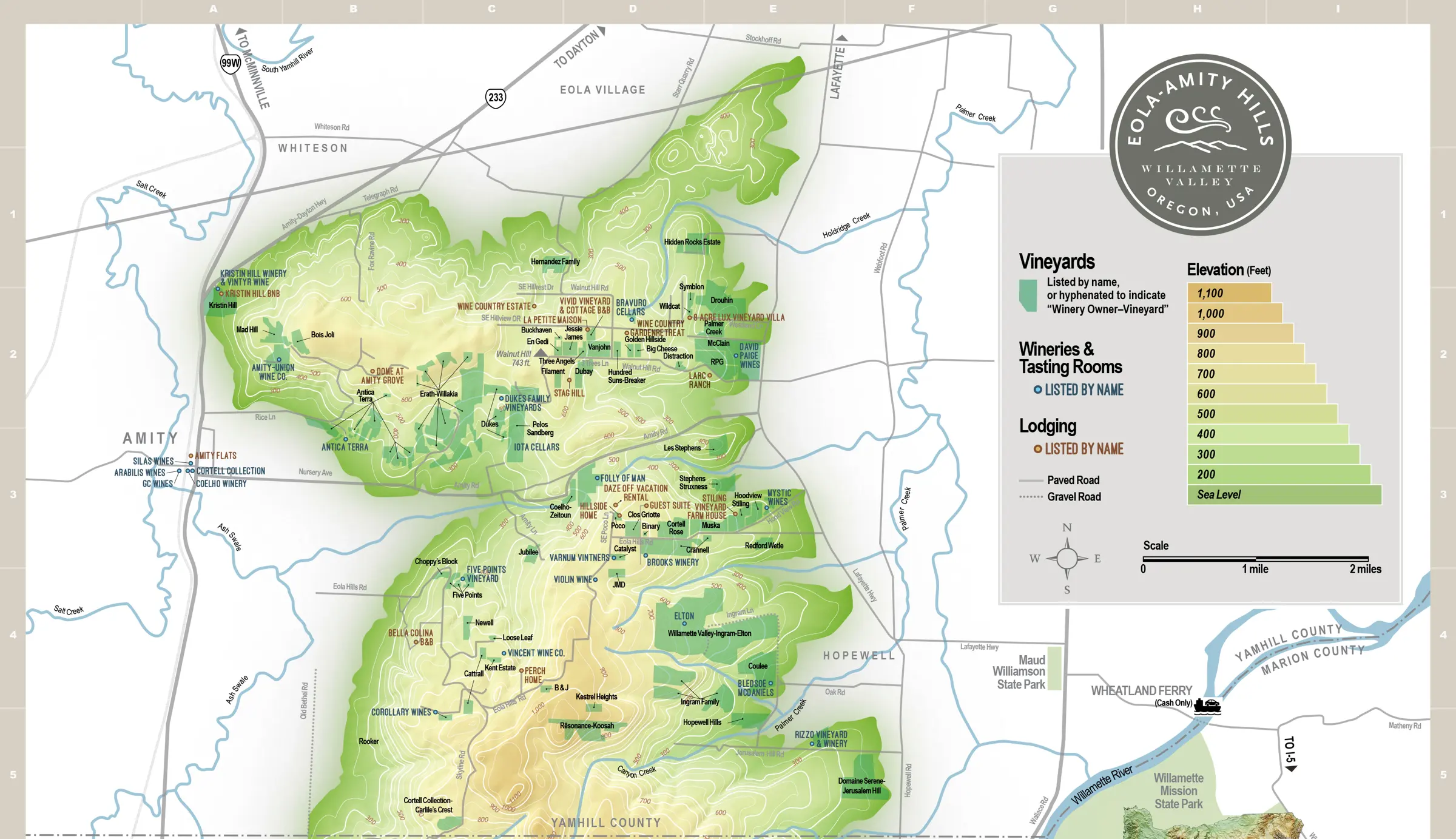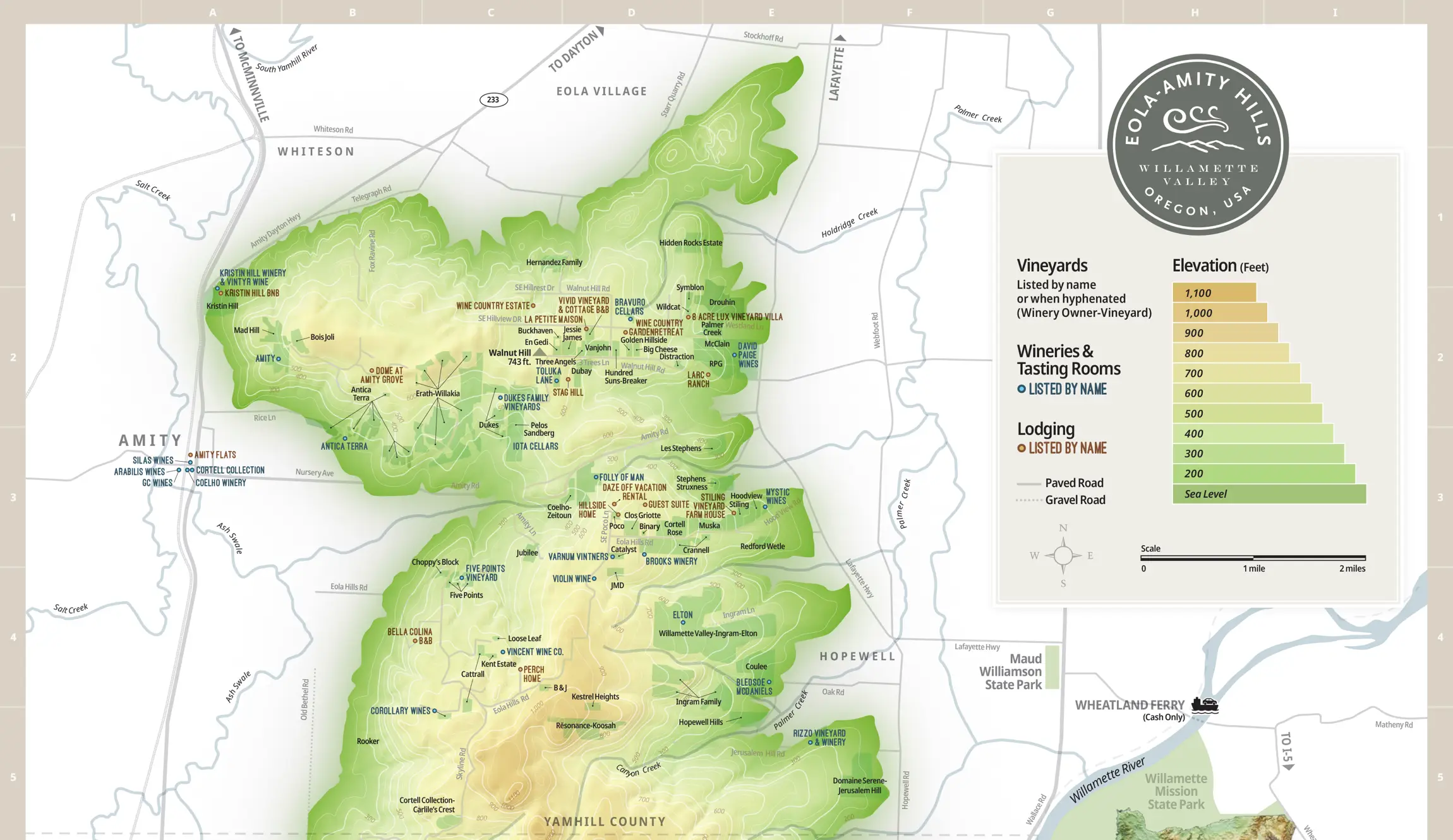 - Exit the ferry, follow the road to Wallace Road (Hwy 221), about one mile. The Eola-Amity Hills are directly in front of you. Turn either right or left on Wallace Road to access the region, depending on your destination.